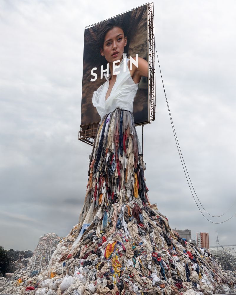 This satirical artwork, generated through artificial intelligence, depicts a massive SHEIN billboard standing atop of a mountain of discarded clothing. A powerful tool of environmental communication that raises urgent questions about the fashion industry and how we consume.