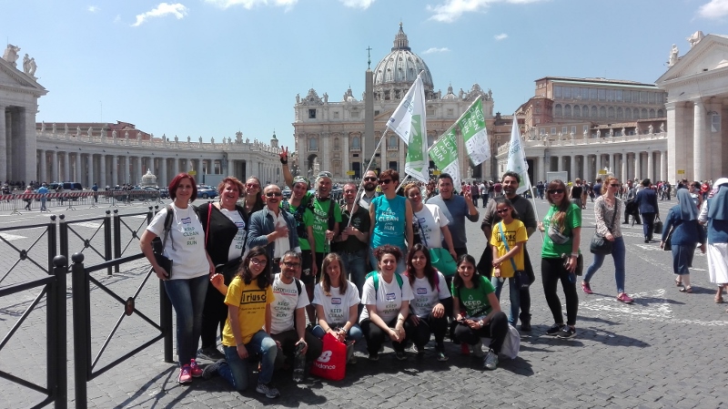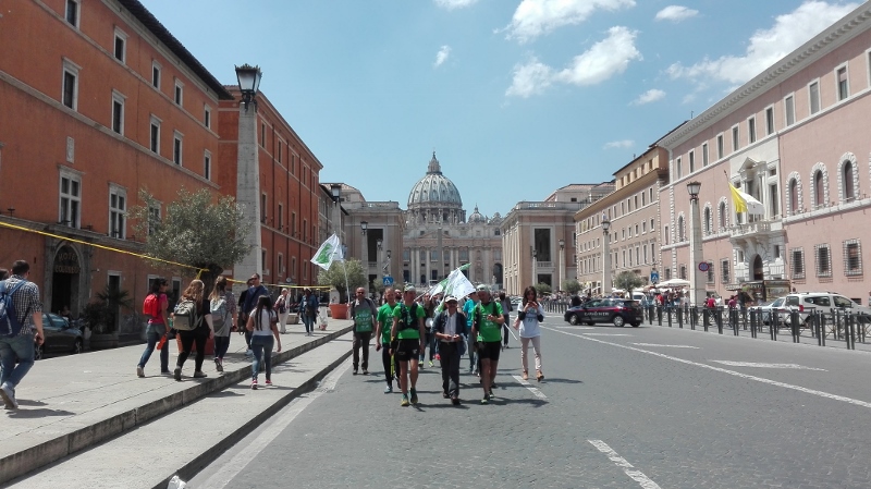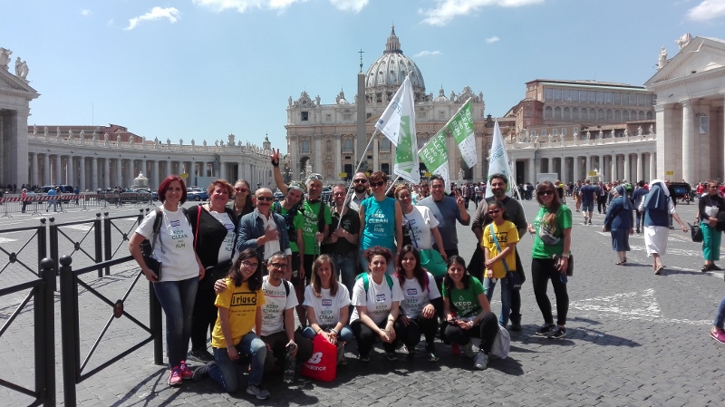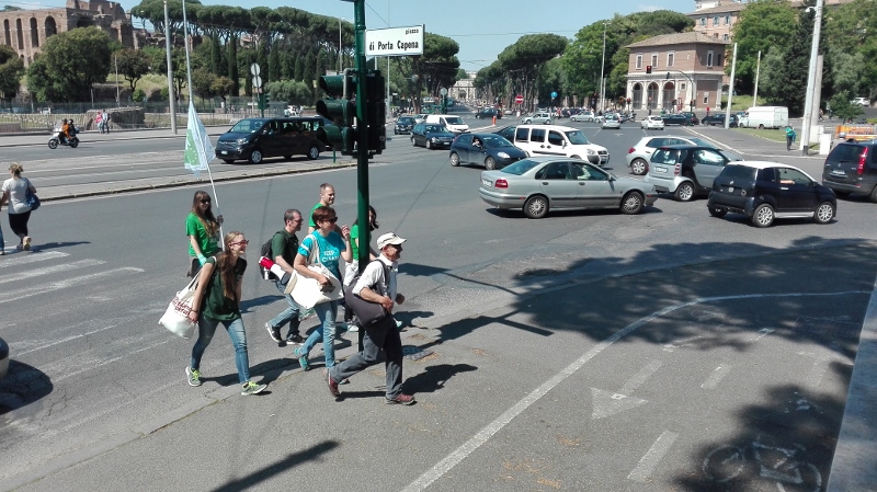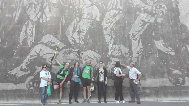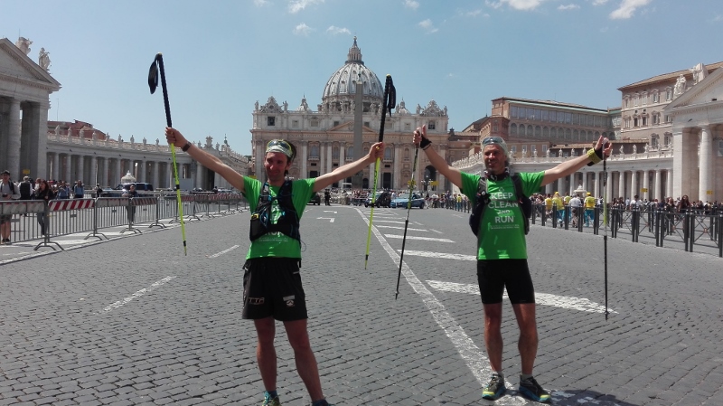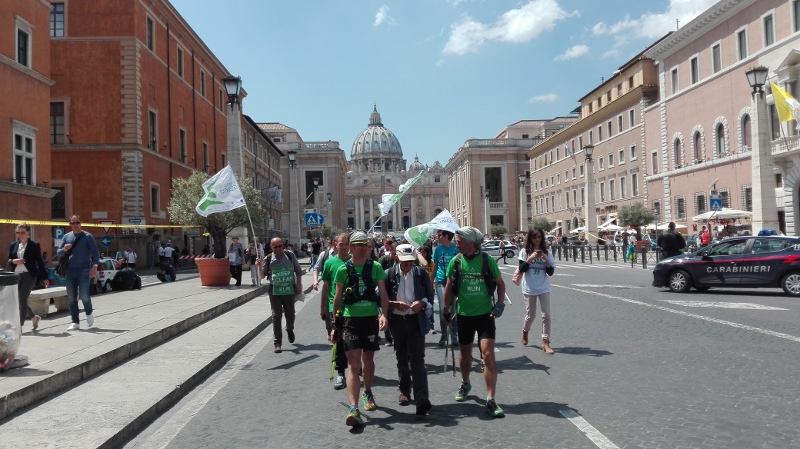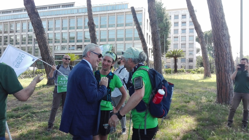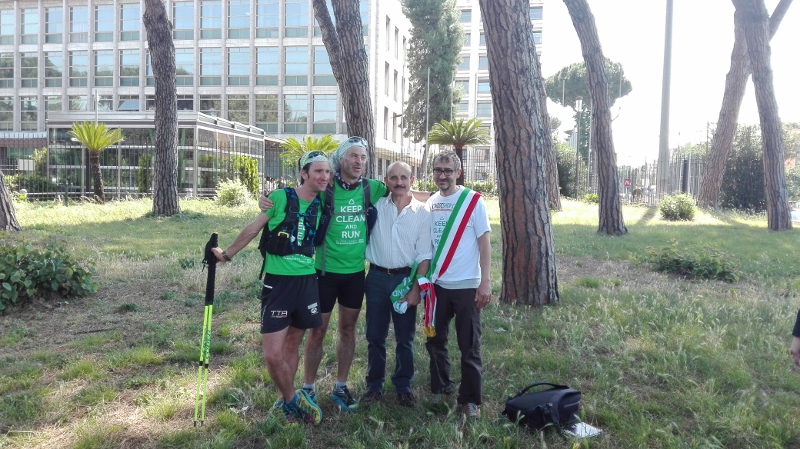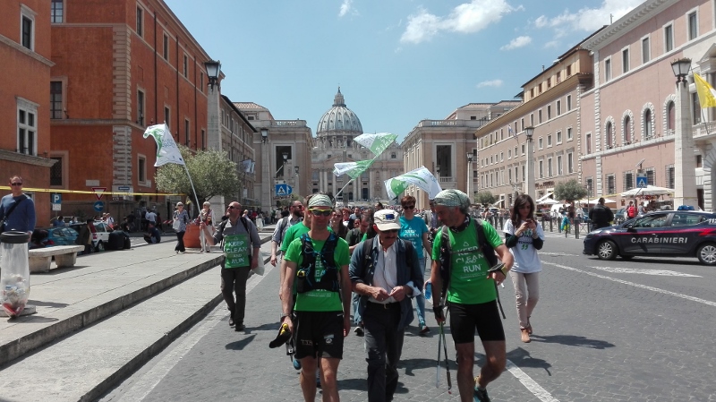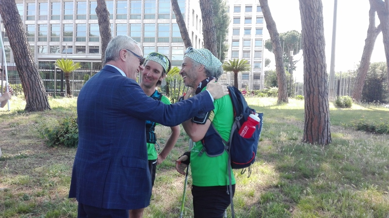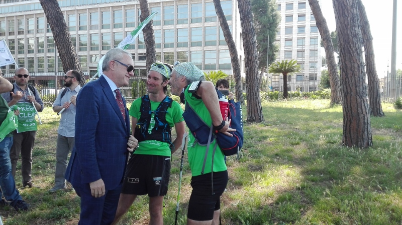 Il mattino seguente Alotto e Cavallo hanno avuto l’incoraggiamento speciale da parte della Sottosegretario all’Ambiente, Barbara Degani, che si è recata alla scuola di frazione Santa Maria di Montelibretti: un gesto per porre l’accento sul tema dell’educazione ambientale: «Il Ministero è orgoglioso di sostenere questa iniziativa per la sua capacità di lanciare un messaggio alle giovani generazioni», ha dichiarato Degani. Un infortunio per Roberto Cavallo ha quindi caratterizzato gli ultimi chilometri fino a Campagnano, sede della penultima tappa, anch’essa ricca di incontri con scolaresche, associazioni e cittadini, impreziositi dalla partecipazione di Lucia Cuffaro (Uno Mattina). L’avvio dell’ultima tappa, con destinazione Vaticano e Roma, è stato in piena notte: il percorso si è snodato lungo la Via Francigena fino a piazza San Pietro, dove a Cavallo e Alotto si sono uniti il testimonial di tappa -l’attore e scrittore Giuseppe Cederna- insieme a sindaci, assessori, sponsor, giornalisti e tanti amici del mondo ambientalista (e non solo), per proseguire insieme lungo le rive del Tevere fino al Circo Massimo, con il traguardo davanti alla sede FAO, accolti da Istituzioni, autorità e testimonial.
