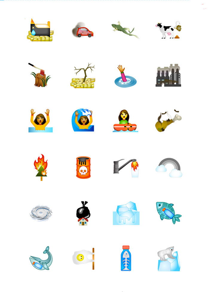 L’obiettivo dei climoji è quello di facilitare il dialogo, le conversazioni, i post sui social media sul tema del clima che cambia e sulle sue cause e dar vita ad “un nuovo vocabolario per esprimere i propri sentimenti” sull’ambiente. Come si può vedere nell’immagine sotto, c’è un climoji per ogni problema ambientale: l’inquinamento, la scomparsa di specie animali, il disboscamento, la siccità, l’emigrazione, lo spreco alimentare, gli incendi, lo scioglimento dei ghiacci, i rifiuti e persino la plastica in mare.