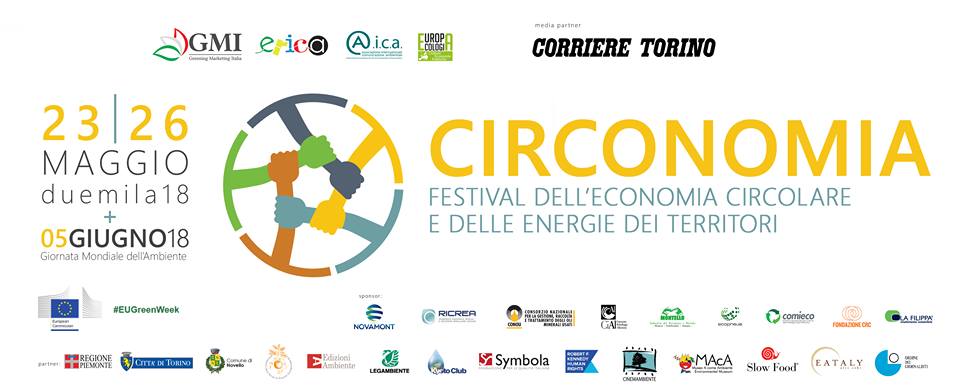 CIRCONOMÌA 2018 è organizzato da Cooperativa Erica, Aica – Associazione Internazionale per la Comunicazione Ambientale, Gmi (Greening Marketing Italia) e Fondazione Europa Ecologia, con il sostegno di Novamont, Ricrea, Conou, CiAl, Montello Spa, Ecopneus, Comieco, Fondazione CRC e La Filippa. Ha il supporto di Regione Piemonte, Città di Torino, Comune di Novello, Università di Scienze Gastronomiche, Edizioni Ambiente, Legambiente, Kyoto Club, Fondazione Symbola, Robert F. Kennedy Human Rights Foundation, CinemAmbiente, MAcA – Museo A come Ambiente, Slow Food, Eataly e Ordine dei Giornalisti del Piemonte.