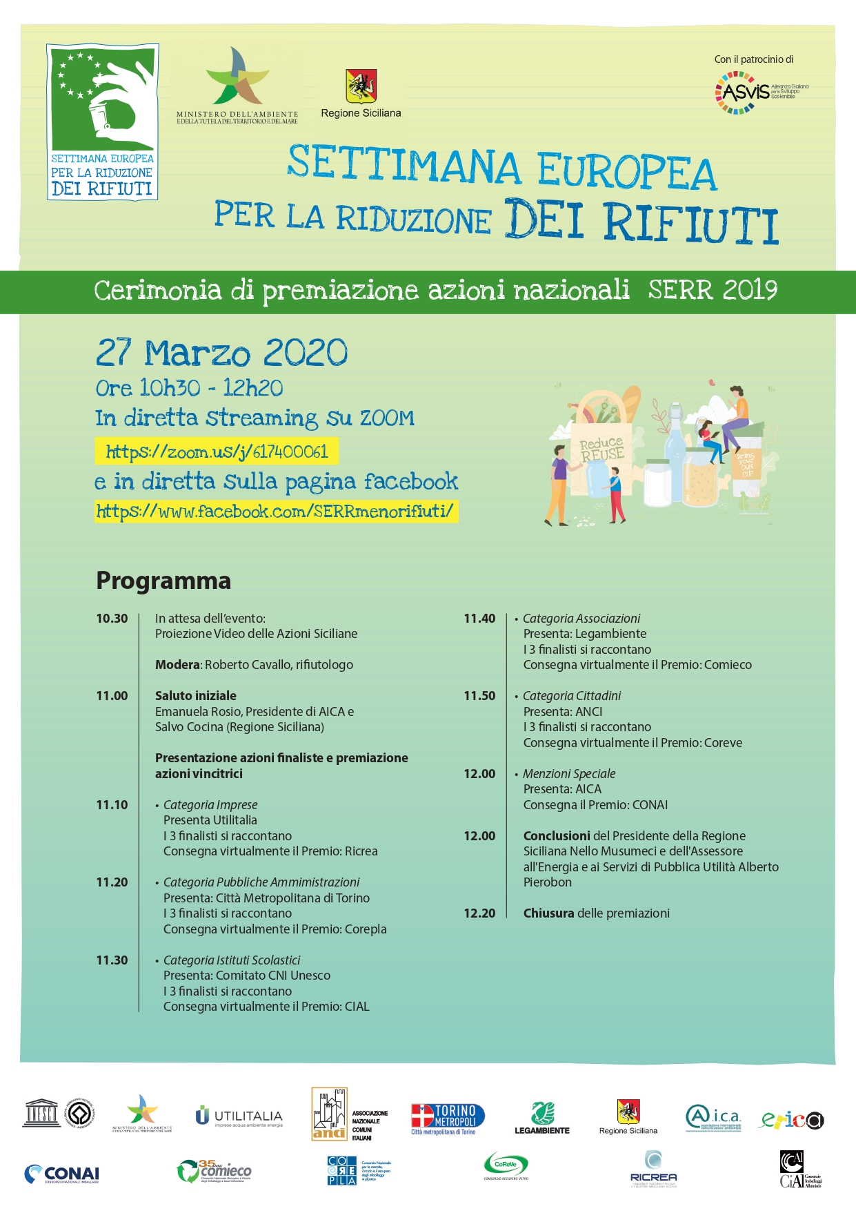 Si terrà venerdì 27 marzo, online e in streaming, la cerimonia di premiazione dell’undicesima edizione della Settimana Europea per la riduzione dei Rifiuti (SERR), che si è svolta in tutta Europa dal 16 al 24 novembre 2019 e che ha visto in Italia ben 5814 azioni realizzate.