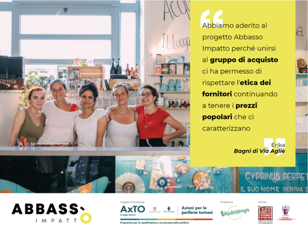 Abbasso Impatto è un progetto che abbiamo sviluppato nel 2019 e che fornisce prodotti e servizi ecosostenibili a prezzi ridotti, sfruttando il modello dei GAS (Gruppi di Acquisto Solidali), rivolti ad esercizi pubblici, enti ed eventi. Grazie a questo progetto, un ristoratore che decide di essere sostenibile può farlo a prezzi più convenienti: capita spesso infatti che, nonostante la sensibilità, poi si debba rinunciare perché economicamente non si riesce a far fronte ai costi. Per questo, soprattutto in San Salvario che è stato luogo di movida per tanto tempo, possiamo cercare di promuovere un consumo consapevole, sostenibile e collaborativo, sfruttando il fattore dell’acquisto collettivo.