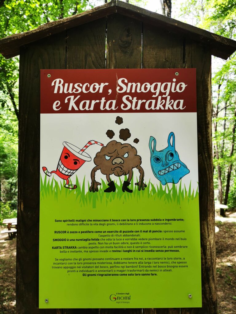 Ma quel che è ancor più entusiasmante è che non è stato concepito esclusivamente per far svagare i più piccoli, bensì nasce per educarli al rispetto dell’ambiente. Per farlo, gli ideatori del progetto hanno pensato bene di mettere in scena una vera e propria fiaba. Man mano che si cammina, infatti, diversi pannelli in legno raccontano le vicende degli gnomi indaffarati a combattere tre spiritelli maligni: Ruscor, Smoggio e Karta Strakka. Ruscor “è zozzo e pestifero come un esercito di puzzole con il mal di pancia, spesso assume l’aspetto di rifiuti abbandonati”. Smoggio, invece, “è una nuvolaglia fetida che odia la luce e vorrebbe veder piombare il mondo nel buio pesto”. Infine Karta Strakka, che “cambia aspetto con molta facilità e non è semplice riconoscerla: può sembrare bella e invitante, ma spesso invade e rovina i luoghi in si insedia senza permesso”.