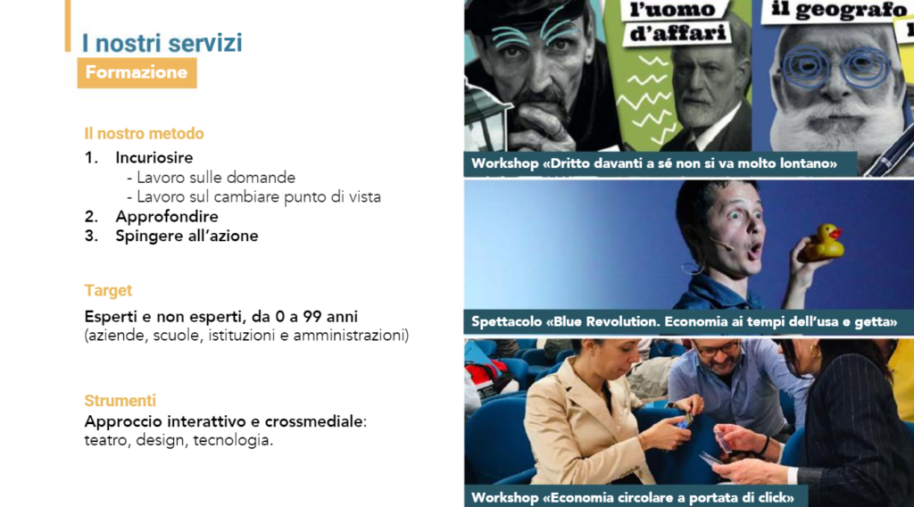 Nella nostra proposta di valore ci definiamo un soggetto ibrido che tiene insieme la dimensione tecnologica, grazie alla app, e di innovazione sociale, poiché crediamo che la componente culturale sia il primo driver che si deve instaurare prima ancora di qualsiasi innovazione tecnologica, quest’ultima abilita solo ulteriormente. L’economia circolare richiede un cambio di paradigma, la visione che abbiamo e su quali valori ci basiamo, dunque, la componente formativa e della consulenza è molto importante. Mercato Circolare si rivolge ad un pubblico vasto, lavora in modo verticale e trasversale, dai giovanissimi agli adulti, con gli addetti ai lavori e no. Inoltre, utilizziamo vari canali come teatro, design e tecnologia per poter arrivare a tutti e in maniera competente.