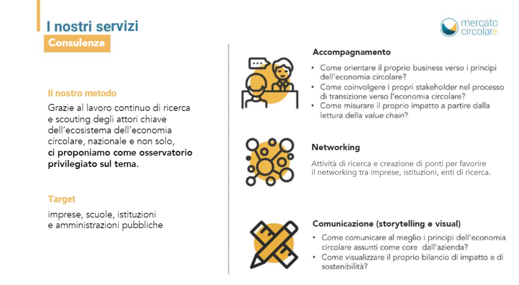 Quando approcciamo il tema dell’economia circolare bisogna dire che è un concetto in divenire e che deve essere compreso dalle istituzioni. Si ha che fare con un concetto che è sia teorico che operativo attorno al quale girano diversi attori, dunque è importante, in un’ottica sistemica, tenere insieme tutti gli attori e a ciascuno dare il proprio ruolo. In questo senso è importante costruire una rete, quindi diversificare chi fa cosa per poi metterli in connessione. All’interno del cluster delle imprese, parlare di rete vuol dire in che modo delle imprese possono collaborare in ottica di simbiosi industriale: avere quindi una mappa delle realtà che lavorano sul territorio aiuta a creare queste connessioni. Noi ci poniamo come osservatorio e piattaforma abilitante sul territorio nazionale e per farlo abbiamo creato uno strumento, l’app Mercato Circolare che nasce per mettere in connessione l’utente con chi, sul territorio italiano, opera sui principi dell’economia circolare.