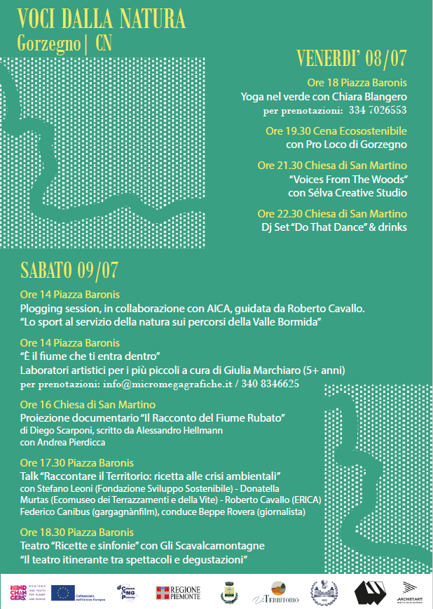 Nel pomeriggio, si terranno poi una sessione di plogging per la pulizia del territorio (in collaborazione con AICA) e dei laboratori artistici per i più piccoli (a cura di Giulia Marchiaro). Seguirà la proiezione del documentario “Il Racconto del Fiume Rubato” di Donatella Murtas, che verrà completata successivamente dal talk “Ambiente e Territorio” – curato da Roberto Cavallo, divulgatore scientifico e AD della Cooperativa ERICA, che avrà come ospite Stefano Leoni (Fondazione Sviluppo Sostenibile). La giornata si concluderà con il teatro itinerante tra spettacoli e degustazioni “Ricette e sinfonie” (Gli Scavalcomontagne).