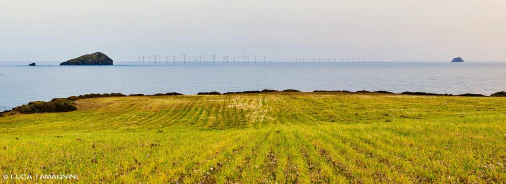 L’eolico offshore (in alto mare) è la nuova frontiera per produrre energia pulita. Per scongiurare un danno al paesaggio costiero, l’eolico offshore dovrebbe essere previsto molto lontano dalla costa, in mare aperto, su fondali marini profondi e senza avere fondamenta fisse. Ho provato con un fotomontaggio ad inserire un parco eolico offshore su un mio paesaggio costiero della Sardegna. Ne ho simulati quattro, a varie distanze e senza nessun fondamento scientifico, solo per mostrare quanto la visione della linea dell’orizzonte possa cambiare e quanti fattori intervengano: densità delle pale, la loro altezza e la distanza dalla costa. In questo senso, la fotografia può addirittura aiutare a immaginare un cambiamento e un’alternativa sostenibile.