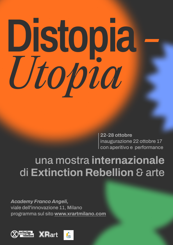 Per Extinction Rebellion l’Arte riveste un ruolo molto importante perché è in grado di comunicare con le persone ad un livello profondo” spiegano gli attivisti di Xr&Art e Extinction Rebellion Milano, organizzatori della mostra “Distopia Utopia”, esposta dal 22 al 28 ottobre 2022 in contemporanea a Milano, Verona, Parigi, Makurdi (Nigeria) e Copenhagen, curata da Gabi Scardi.