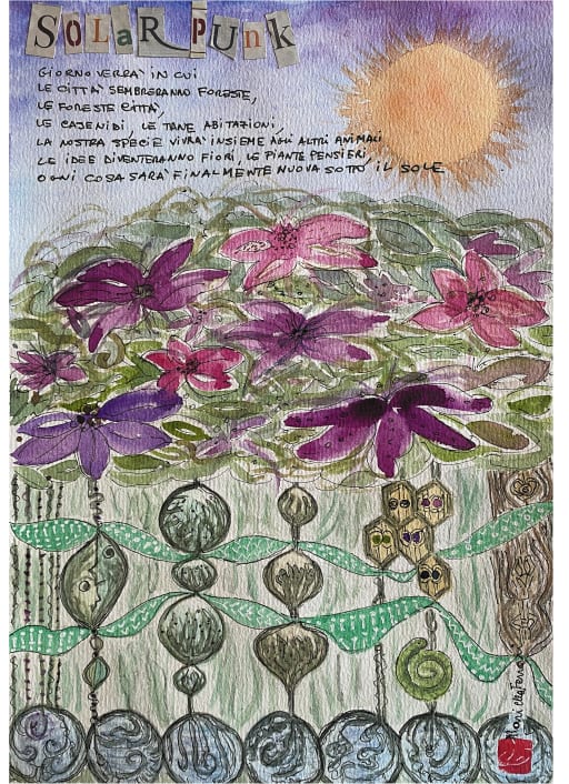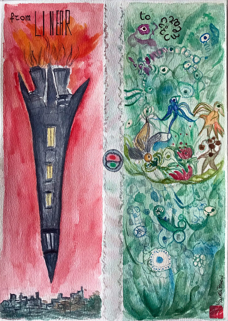 Ho risposto con entusiasmo alla chiamata di XR pur non essendo attivista, perché condivido le tematiche e perché credo che l’arte possa contribuire a diffondere un messaggio di speranza. Noi dobbiamo cercare il bello di una visione che risolva la fatica di vivere. Nel 2021 ho presentato “Solar Punk”, acquerello e collage su carta. Quest’anno ho realizzato un altro acquerello, “From Linear to Circular”. Amo molto questa tecnica, negli acquerelli non si deve coprire il chiaro, bisogna mantenere la trasparenza ed è molto simbolica, secondo me, questa leggerezza. Inoltre, non prevede utilizzo dei solventi e quindi rimane un mezzo poco impattante che me lo fa amare ancora di più.