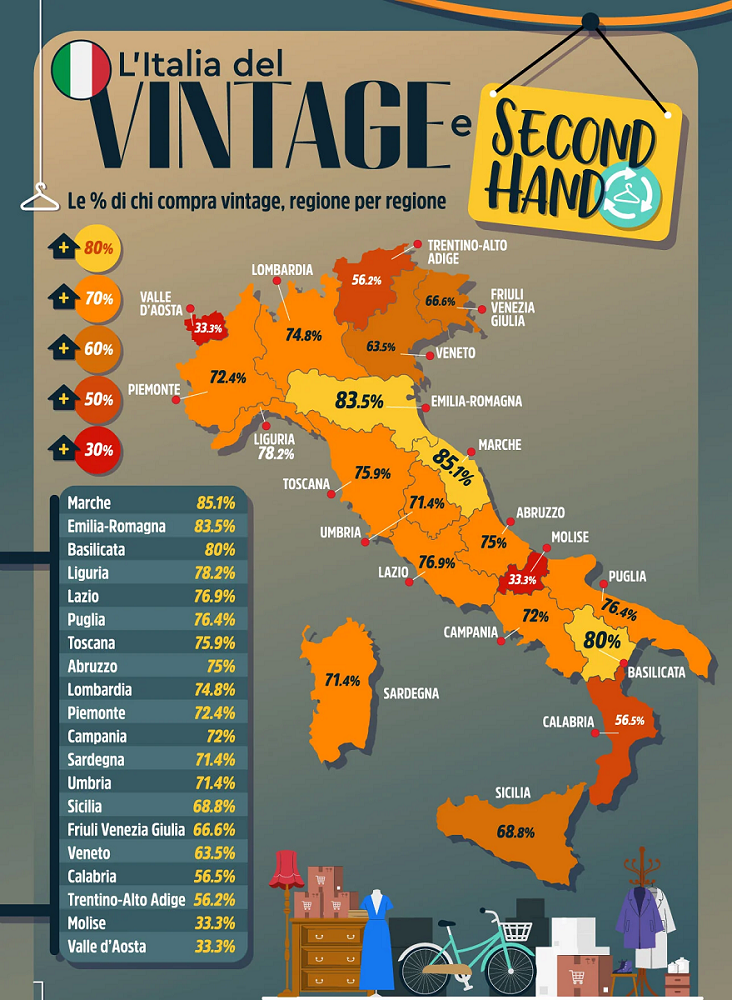 Già a livello territoriale, arrivano le prime sorprese: nonostante Milano sia la capitale dei negozi vintage e second hand, Marche, Emilia-Romagna e Basilicata sono al vertice di questa speciale classifica. Infatti, l’85.1% dei cittadini marchigiani sceglie di acquistare vintage e beni di seconda mano. A seguire l’Emilia-Romagna (83.5%) e la Basilicata (80%). In coda Valle d’Aosta e Molise, con solo un utente su tre che acquista vintage o di seconda mano, anche a causa della scarsità di negozi o mercatini vintage.