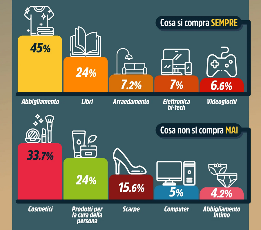 Ma cosa si compra? Al primo posto l’abbigliamento (45%) seguito dai libri al 24%. Molto più staccato l’arredamento, con il 7%. Scarso interesse invece per i cosmetici e i prodotti per la persona, visto che complessivamente non li comprerebbe mai quasi oltre il 57% degli intervistati.
