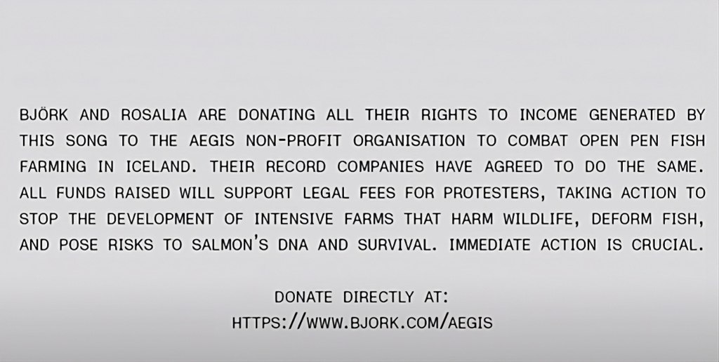 Björk e ROSALÍA doneranno infatti tutti i proventi generati da questo brano all’organizzazione no-profit AEGIS per combattere l’allevamento a rete aperta in Islanda. Le case discografiche a loro associate, ispirate da questa scelta, hanno accettato di fare lo stesso. Tutti i fondi serviranno a sostenere le spese legali dei manifestanti e ad agire per fermare lo sviluppo di queste attività intensive che danneggiano la fauna selvatica.