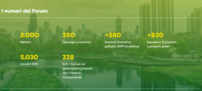 - Formazione con la GPP Academy. Nei due giorni si è potuta tenere un’interessante agenda di incontri, smart e digital, con le voci di Fondazione Ecosistemi, ente promotore dell’evento insieme al Ministero dell’Ambiente e della Sicurezza Energetica.