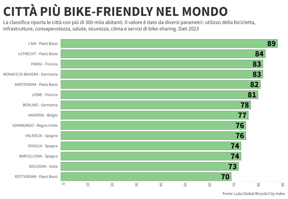 Relativamente all’Italia nel 2024 il 61% degli italiani e delle italiane possiede una bicicletta. Numeri distanti dai trascinatori di questa classifica, come Cina, Stati Uniti e Giappone, ma comunque rilevanti. Oggi la percentuale di chi utilizza la bicicletta con frequenza (come per gli spostamenti casa-lavoro) è pari al 4,7%.