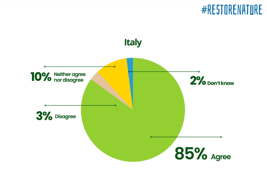 Del risultato ottenuto a Bruxelles ne ha parlato anche l’Italia, con le 32 associazioni italiane che hanno aderito alla campagna #WeAreNature #RestoreNature promossa da oltre 300 associazioni per l’approvazione della legge europea. Tra queste ENPA, Legambiente, Lipu – BirdLife Italia e WWF Italia.