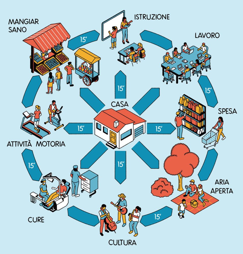 Ripensare i centri urbani per garantire ad ogni cittadino e cittadina di spostarsi e raggiungere i servizi essenziali in massimo 15 minuti di viaggio, in bici o a piedi. Un modello ideato nel 2016 da Carlos Moreno, professore universitario alla Sorbona di Parigi, denominato Città dei 15 minuti.