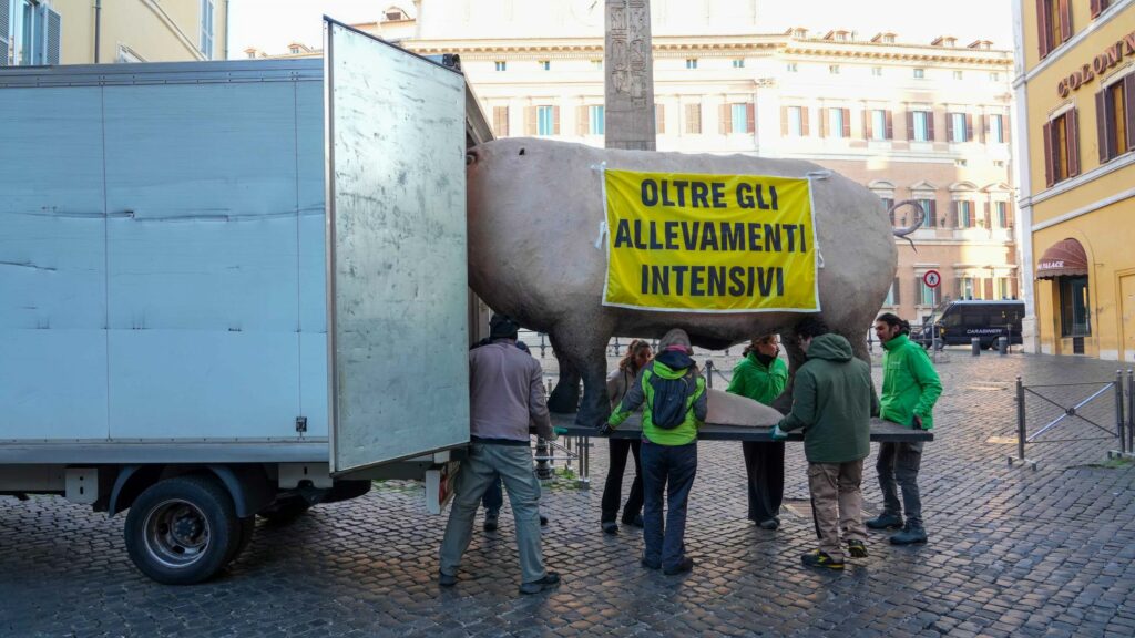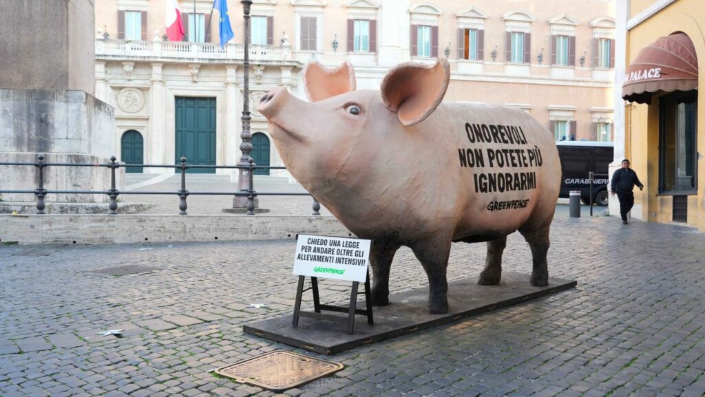 L’azione fa parte della campagna di Greenpeace Italia e ha come obiettivo attirare l’attenzione del Parlamento sulla necessità di discutere la proposta di legge “Oltre gli allevamenti intensivi”.