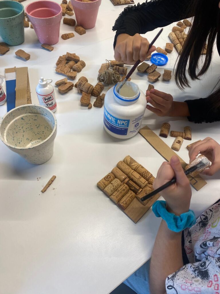 Il secondo incontro è un laboratorio, un momento in cui lavorano con confezioni in carta compositi, tappi di sughero o rotoli di carta igienica. Rifiuti domestici che proviamo a trasformare insieme per incoraggiarli a guardare questi oggetti in un modo diverso, a rendersi conto che ogni potenziale rifiuto nasconde un consumo di risorse.