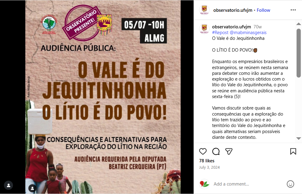 Molti sono i papers e i congressi che hanno messo al centro la questione estrattivista in Minas Gerais. L’Observatório dos Vales e do Semiárido Mineiro della UFVJM (Universidade Federal dos Vales do Jequitinhonha e Mucuri) da anni sta monitorando e studiando in profondità l’attività mineraria nella regione.