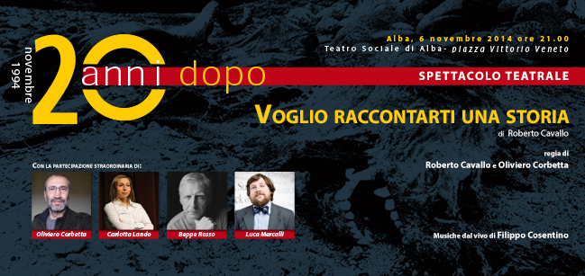 A vent’anni dal tragico evento, lo spettacolo teatrale “Voglio Raccontarti una Storia” di Roberto Cavallo al Teatro Sociale di Alba giovedì 6 novembre alle 21. di Giuseppe Totaro Per non dimenticare. Per coltivare il ricordo. Per ricordarci che bisogna sempre tenere alto il livello di guardia di fronte alle calamità naturali. A vent’anni dalla tragica … Leggi tutto